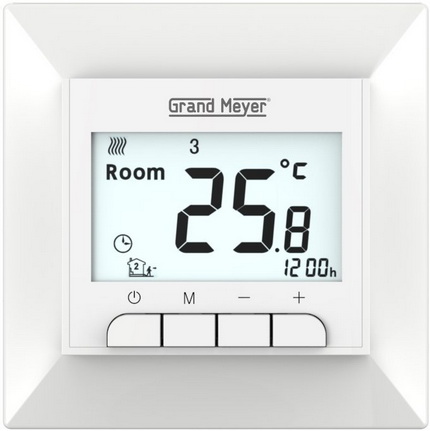 Grand Meyer Mondial Series GM-119, программируемый терморегулятор для управления отоплением электрического типа. Возможность программируемого а так же ручного управления. Возможность установки недельного периода 5+2/6+1/7 дней. Максимальная нагрузка 3600 W. Установка в стандартную монтажную коробку. Память настроек при отключении питания. Огнезащитный пластик. NTC датчик. Диапазон установки: от +5оС до +45оС (заводские)